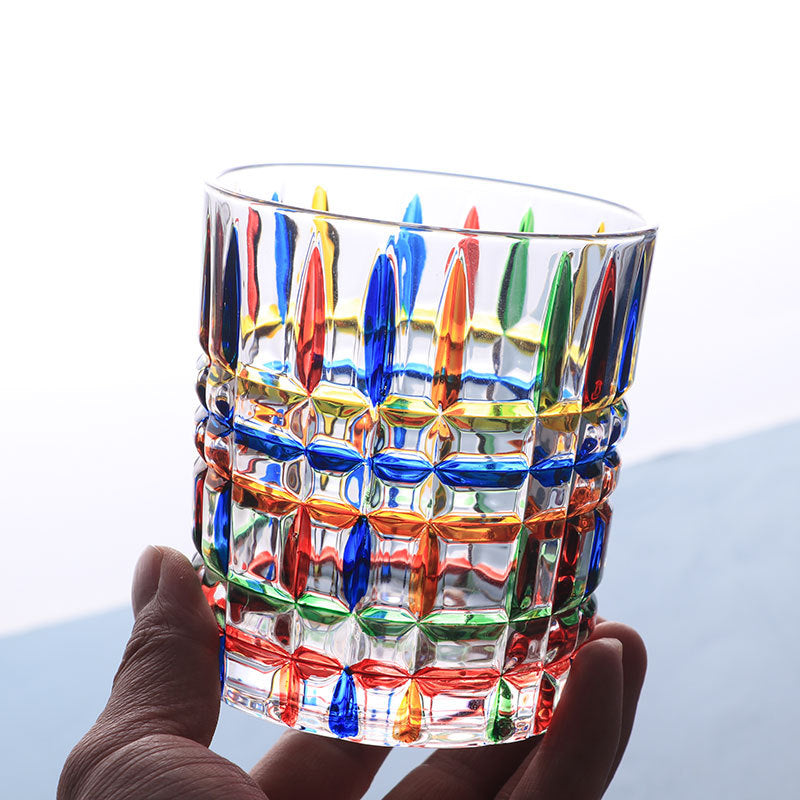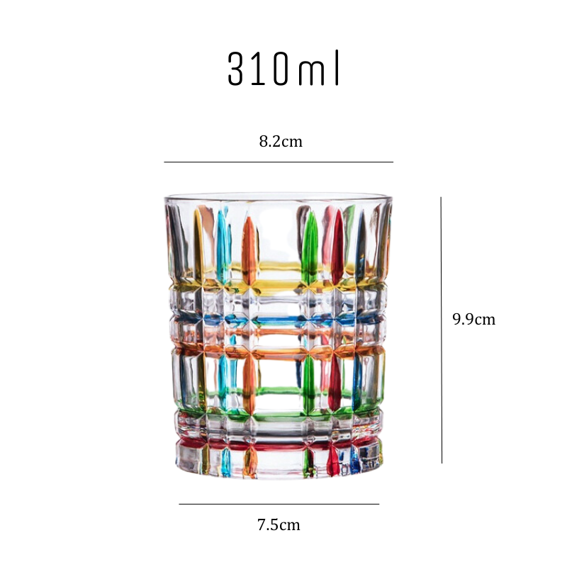 The intricately painted grids in shades of yellow, blue, green, and red dazzle and dance showcases in the glass, makes every drink a celebratory affair. This unique piece transforms mundane moments into instances of sheer elegance, always ready to uplift your spirit.